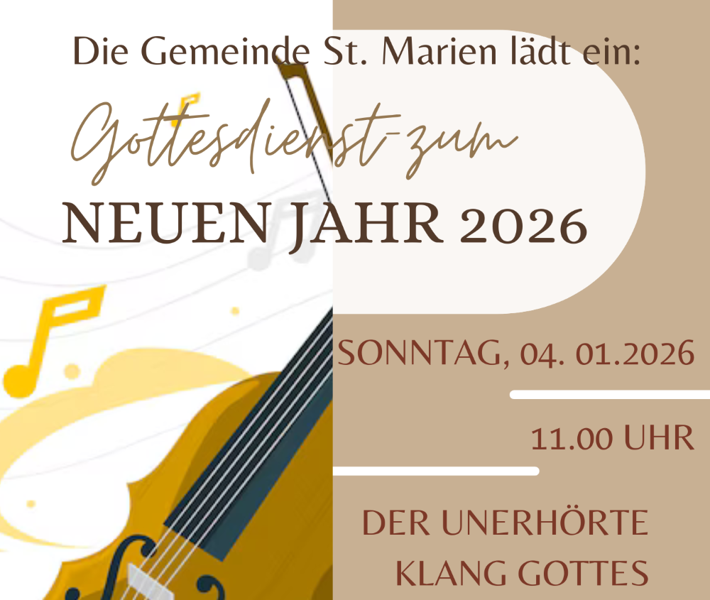 Am Sonntag, 04.01.2026 lädt die Gemeinde St. Marien zum Neujahrsempfang 2026, beginnend um 11.00 Uhr mit einem besonders gestalteten Gottesdienst unter dem Motto "Der unerhörte Klang Gottes". Der Gottesdienst wird musikalisch mitgestaltet von der Chorgemeinschaft St. Ludgerus, sowie Peter Ricken (Geige). Im Anschluss möchten wir mit allen Gottesdienstbesucher*innen mit einem Gläschen Sekt auf das Neue Jahr anstoßen. Es werden ebenfalls Kaffee und Schnittchen gereicht.