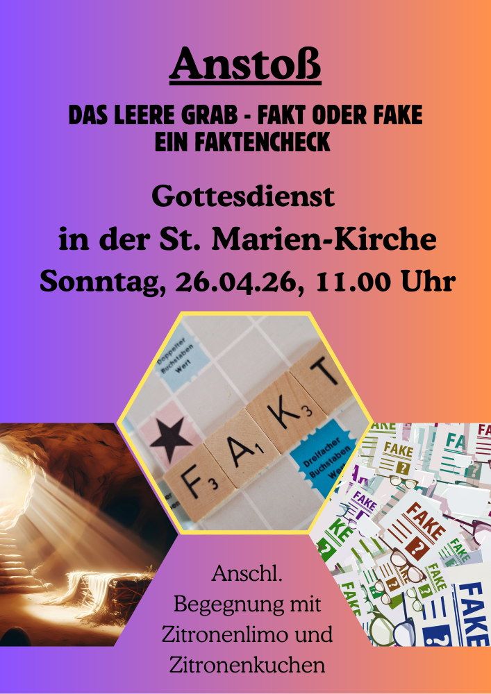 Der Liturgiekreis "Anstoß" lädt ein und versucht den Faktencheck! Der Gottesdienst ist kreativ gestaltet und möchte Anstöße für Leben und Glauben geben. War das Grab wirklich leer? Ist das leere Grab ein Beweis für die Auferstehung Jesu? Welche Fragen und Zweifel habe ich? Darf ich diese Zweifel haben? Diesen Fragen wollen wir uns stellen und uns im Glauben stärken lassen. Im Anschluss an den Gottesdienst lädt das Vorbereitungsteam zu Zitronenlimo, Zitronenkuchen und Keksen ein. Warum? Lassen Sie sich überraschen. Kaffee gibt es natürlich auch.