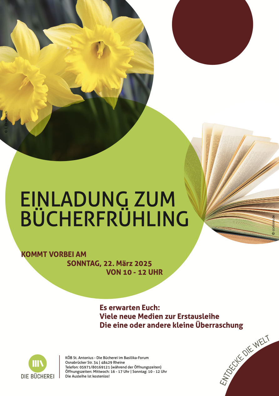 „Sprich Du das Wort, das tröstet und befreit“ - so das Thema des diesjährigen Besinnungstages mit Anna Held am 19.3. im KUBUS von 9.30 - 17.00 Uhr. Worte können verletzen, töten, klein machen, bedrohen … Worte können heilen, gesund machen, Leben schenken…Worte können die Wahrheit verdrehen, Lügen in die Welt setzen… Worte können… Diesen Aussagen wollen wir uns an dem Tag gemeinsam stellen und nach Antworten suchen. Der Tag kostet ca. 35 Euro, die an dem Tag gezahlt werden. Anmeldungen nehmen bis Donnerstag, 12.2. Chr.Jansen, Tel. 66566 und M. Holtrup, Tel. 6011 entgegen.